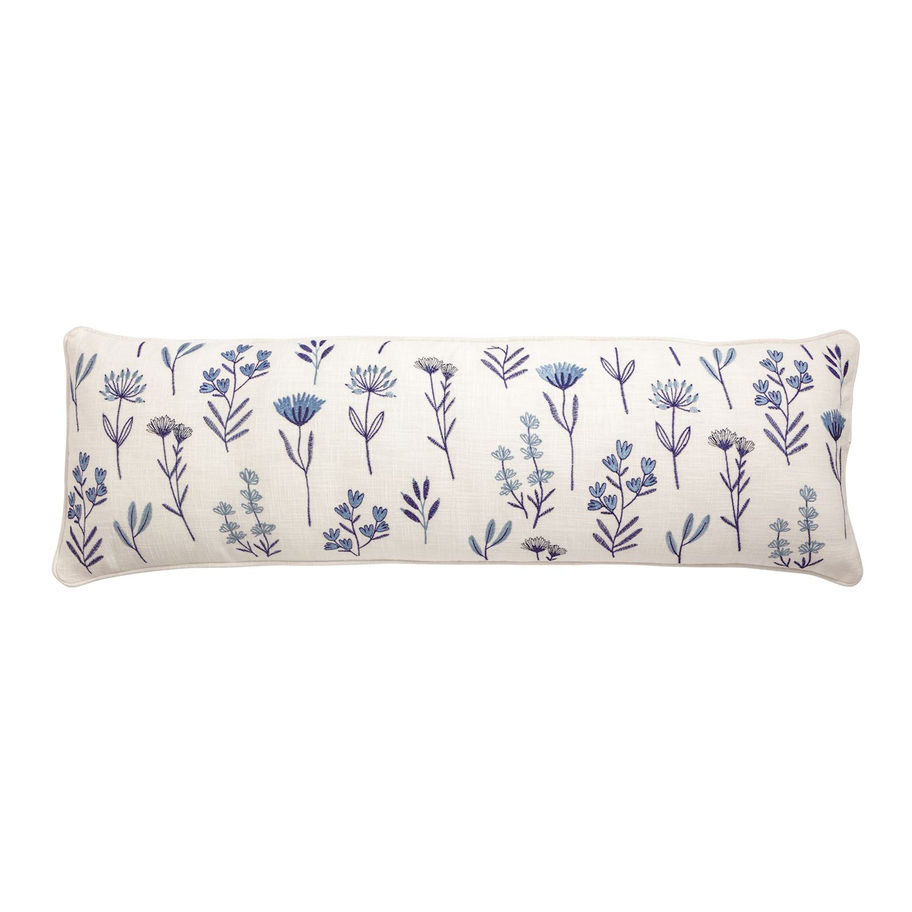 Embroidered cotton long pillow with piped edge. Zipper closure.